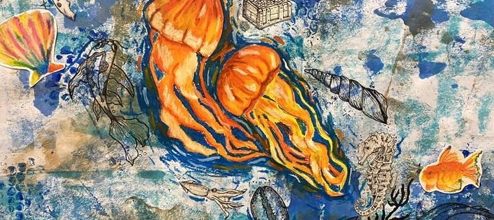 The Year 11 stunning seashore mixed media sheets are now on display in the Art rooms. This new project began last year in the Year 10 workshop, where students created lino prints of sea life, which have now been developed into a wonderful mix of drawings, oil pastels, printmaking, and beautifully collaged sheets.
